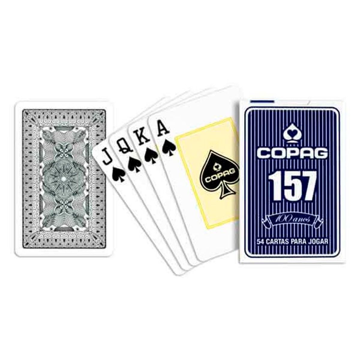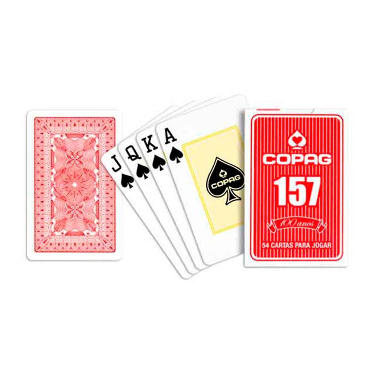 Jogo de Baralho 157 Tradicional Copag naipe convencional, com cartas do tamanho Bridge Size (57x89mm), contém 54 cartas produzidas em exclusivo cartão couché 275gr, não transparentes, atóxicas e recicláveis. Marca: Copag.