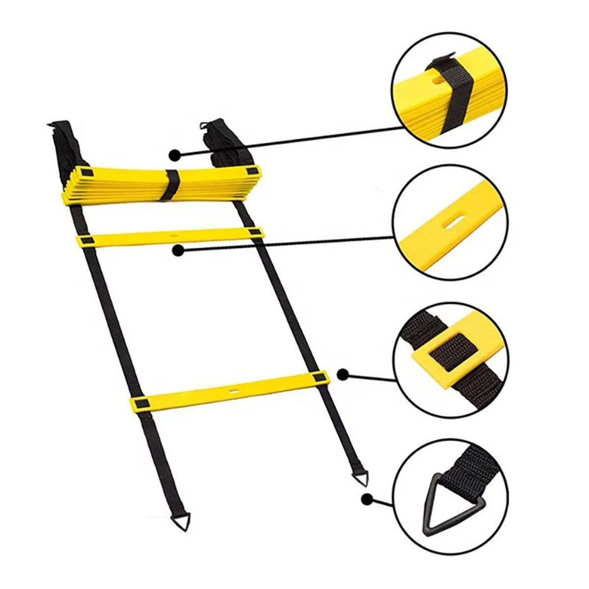 scada de agilidade com 16 degraus ajustáveis e 8m de comprimento. Excelente custo-benefício, fabricada com fitas de nylon de 2,5 cm de largura e 08 degraus de PVC com 50 cm de comprimento, 4 cm de largura e 3mm de espessura. Comprimento total de 8 metros. Botões nas pontas para unir mais de uma escada. Acompanha bolsa para transporte do equipamento.