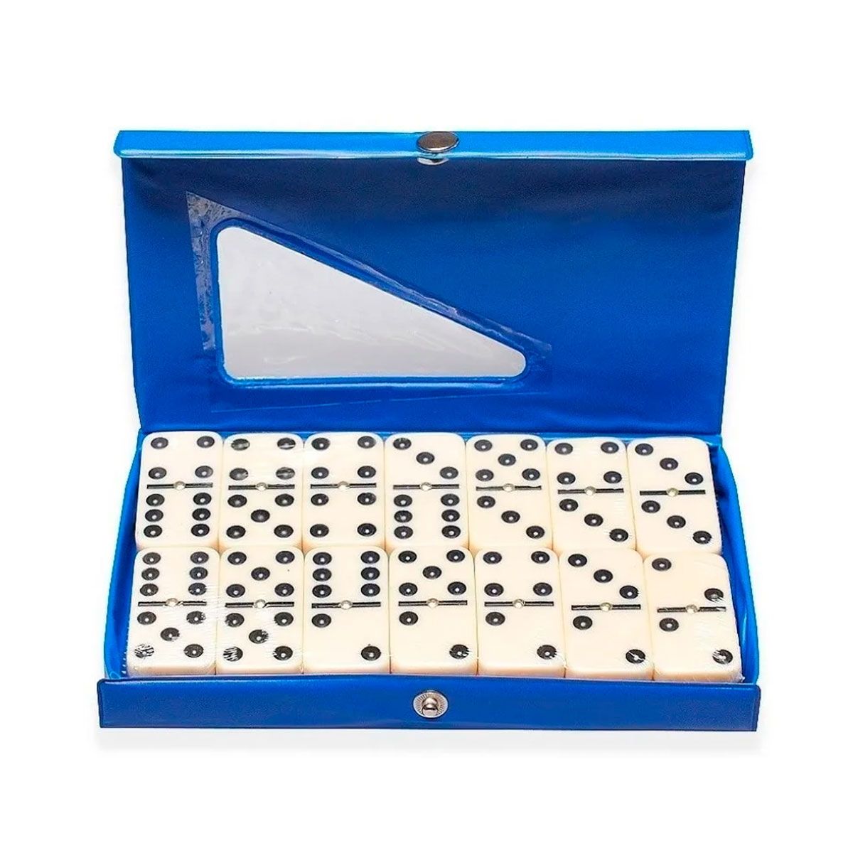 Jogo de Dominó fabricado em resina com 28 pedras, Dimensões das pedras: 46x23x10mm. Peso individual das pedras: 15g. Dimensões aproximadas da embalagem 17x10x2,8cm. Peso total: 470g. Material de fabricação plástico rígido.