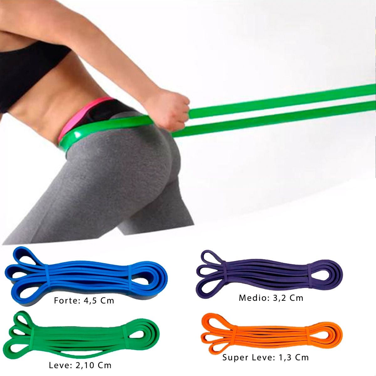 As faixas Super Band da Azul Esportes são faixas circulares indicadas para potencializar os treinos de força, alongamento, fitness, crossfit, condicionamento corporal, pós cirúrgico, fisioterapia, treino esportivo e fortalecimento muscular. Confeccionada em Látex de Altíssima Resistência. Kit composto por 1 faixa super leve, 1 faixa leve 1 faixa média, 1 faixa forte. Acompanha bolsa para transporte. Características: - Intensidade: Super Leve; - Largura: 1,3 cm; - Comprimento Total: Aproximadamente 208cm; - Espessura: 0,5cm; - Cor: Laranja; Características: - Intensidade: Leve; - Largura: 2,1cm; - Comprimento Total: Aproximadamente 208cm; - Espessura: 0,5cm; - Cor: Verde; - Intensidade: Medio; - Largura: 3,2cm; - Comprimento Total: Aproximadamente 208cm; - Espessura: 0,5cm; - Cor: Roxa; - Intensidade Forte; - Largura: 4,5cm; - Comprimento Total: Aproximadamente 208cm; - Espessura: 0,5cm; - Cor: Azul;