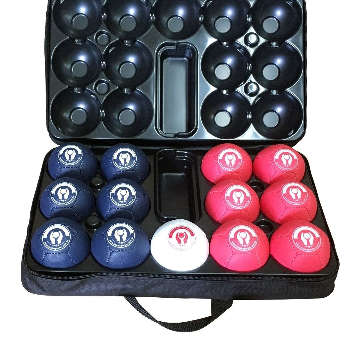 Kit de Bocha adaptada alto rendimento podendo ser usado em competições e treinamento. Bolas com enchimento de granulado PET material reciclável, confeccionada em couro PU costurado a mão. Composto por 6 bolas Vermelhas, 6 bolas Azuis e 1 bola branca. Cada bola pesa 275g ± 12g. Circunferência de 270mm ± 8mm de acordo com as regras da entidade regulamentadora BISFED (Boccia Internacional Sports Federation). O Kit acompanha uma maleta para transportes e Forma em PVC mantendo a aferição total e o aumento da vida útil das bolas, trazendo mais precisão em seu lançamento, o que só é possível com a Forma em PVC.