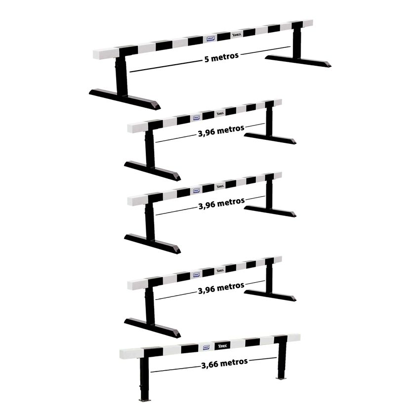 Kit Completo Obstáculos Steeplechase de atletismo de fabricada em tubos de aço quadrados, coberto com madeira de alta resistência à prova d´água. Conjunto com 05 unidades contendo 1 com 3,66 metros (fosso), 3 com 3,96 metros e 1 com 5,00 metros. Recomendado para competições e treinamento. Certificado pela IAAF. Marca: Vinex.