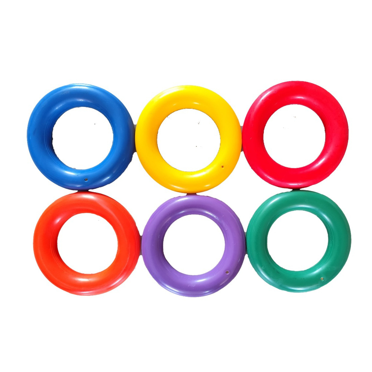 6 argolas de borracha com aproximadamente 16cm de diâmetro (laranja, verde, vermelho, amarelo, roxo e azul)