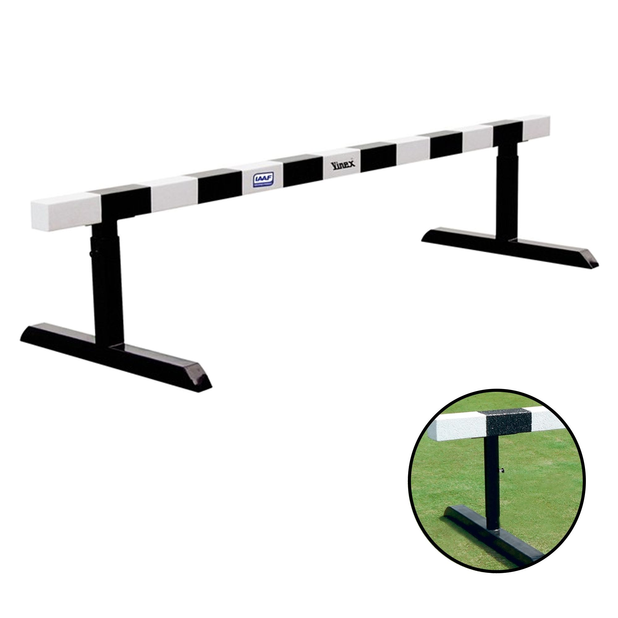 Obstáculo atletismo steeplechase fabricada em tubos de aço quadrados, com 3,96m de comprimento e travessão de 100mm x 100mm coberto com madeira de alta resistência à prova d´água. Sistema de altura ajustável em até três níveis. Certificado pela IAAF. Modelo: SCB-100. Marca: Vinex.