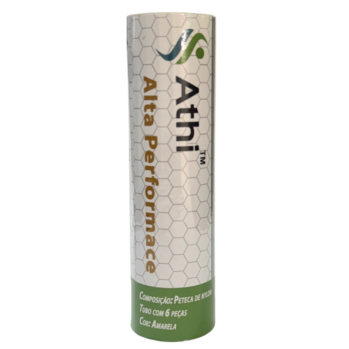 Peteca de badminton Nylon Alto Rendimento, Cor: Amarela. Peso: 5,2g. Altura: 8,5cm. Diâmetro da base: 2,8cm. Saia de Nylon: Diâmetro da saia (superior): 6,7cm, Altura da saia: 6,0cm. Durabilidade, consistencia e vôo: A+ .Tubo c/ 6 Unidades. Marca: ATHI