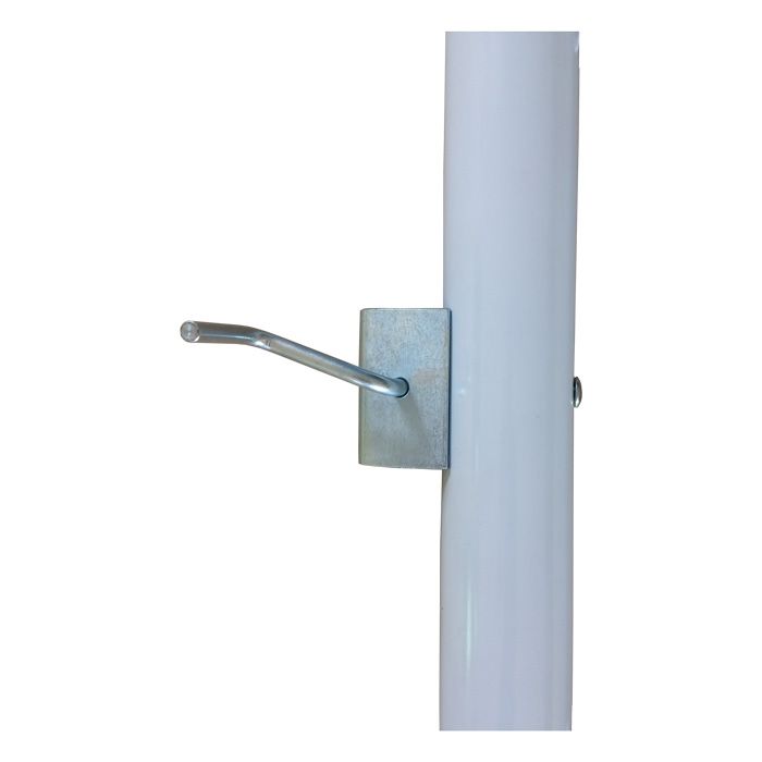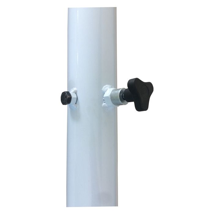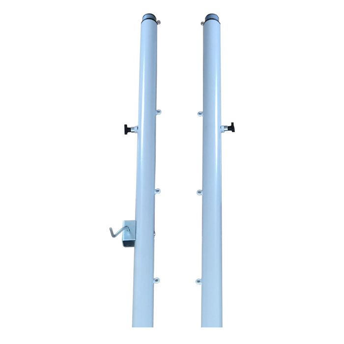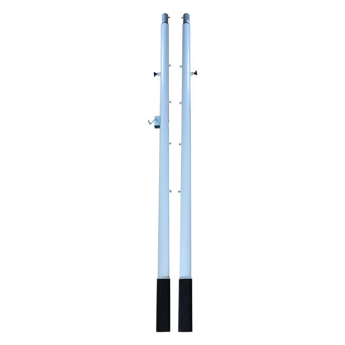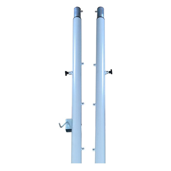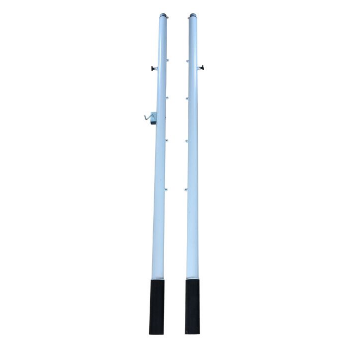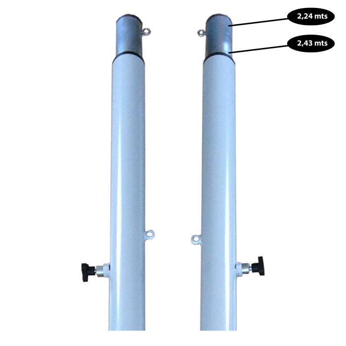 Poste de Peteca Profissional. - Fabricado em tubo de aço com regulador de altura em alumínio; - Ponteira em pvc injetada para facilitar a passagem do cabo de aço; - Pintura eletrostática a pó com argolas de fixação da rede em alumínio; - Sistema rapid fire de travamento das medidas com alta precisão para total aferição; - Cremalheira em aço inox com sistema de travamento de fácil manuseio; - Bucha de PVC para fixação ao solo. A altura pode ser ajustável em: 2,24 m (feminino) e 2,43 m (masculino). Conjunto com 2 unidades.