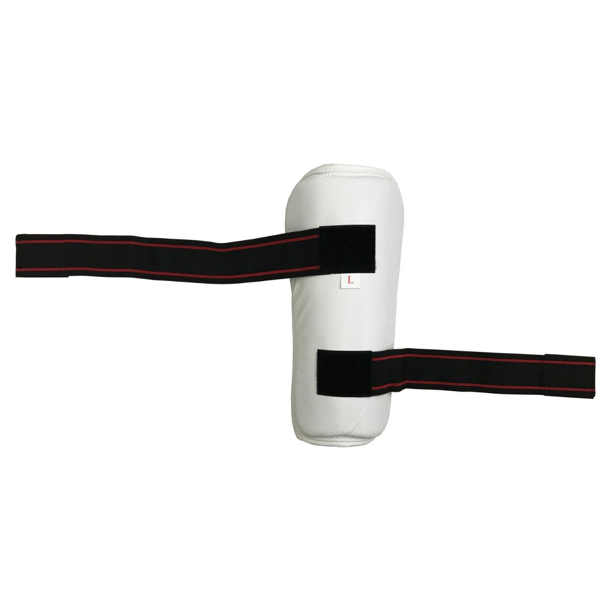 Protetor de canela (caneleira) para taekwondo, confeccionado em espuma injetada de PU com de absorção extras de impacto, revestido em couro ecológico, desenho anatômico. Triplo fechamento em tira de elastano com velcro reforçado, elástico extra para travamento dos pés.