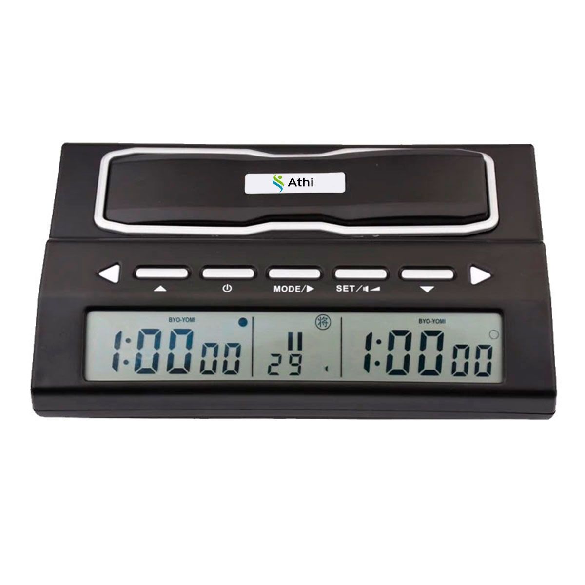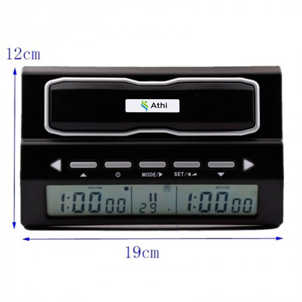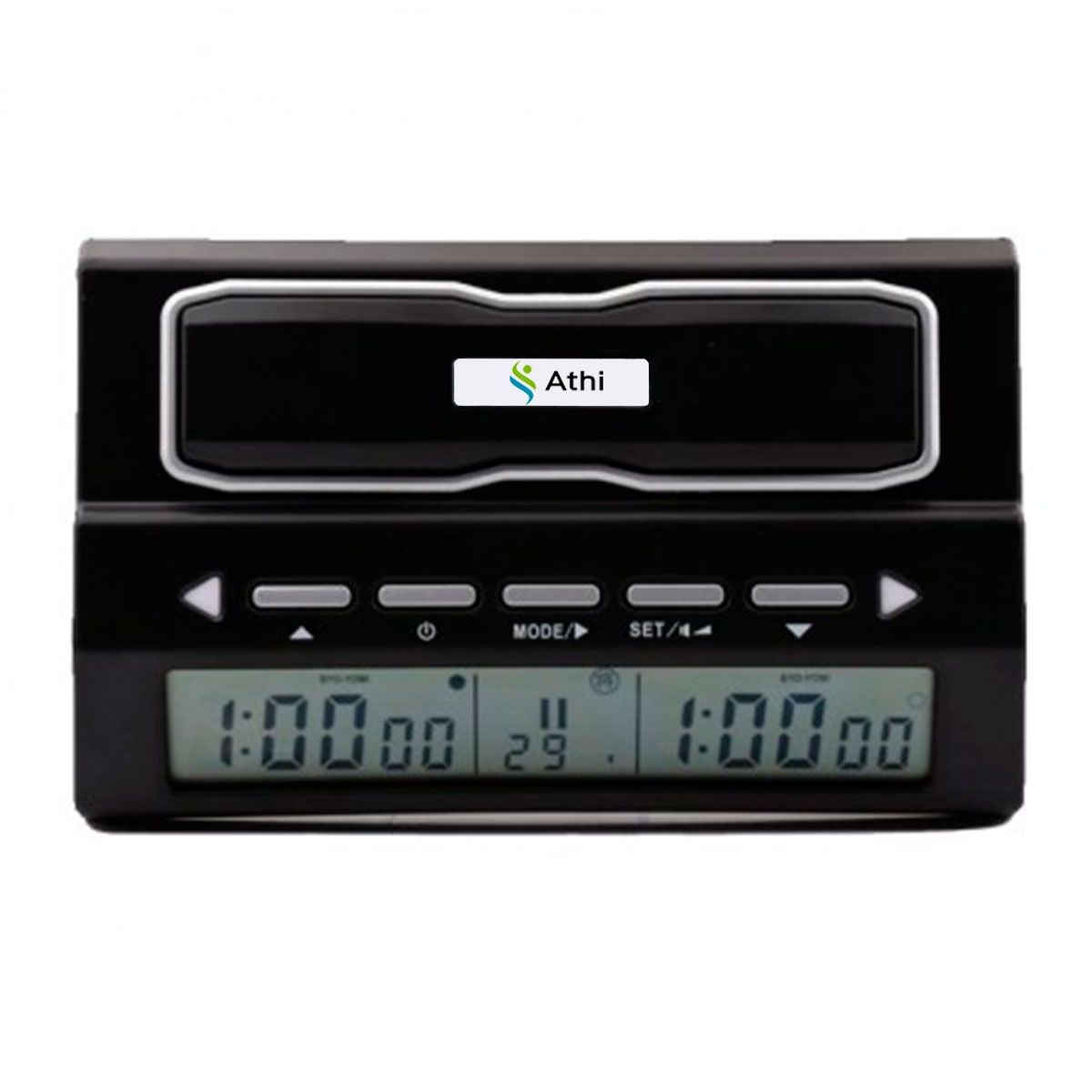 Relógio De Xadrez Digital, feito em ABS e com visor digital multifunções e display claro, medindo 16,1 cm x 10 cm x 6,2 cm, alimentação por 2 pilhas AA. Indicado para controlar o tempo de suas partidas com cronômetro regressivo para cada jogador, aviso sonoro para o final do tempo, memória que salva a última configuração, contador de movimentos . Pode ser utilizado para qualquer jogo de dois jogadores. Peso: 250g. Marca: Athi.