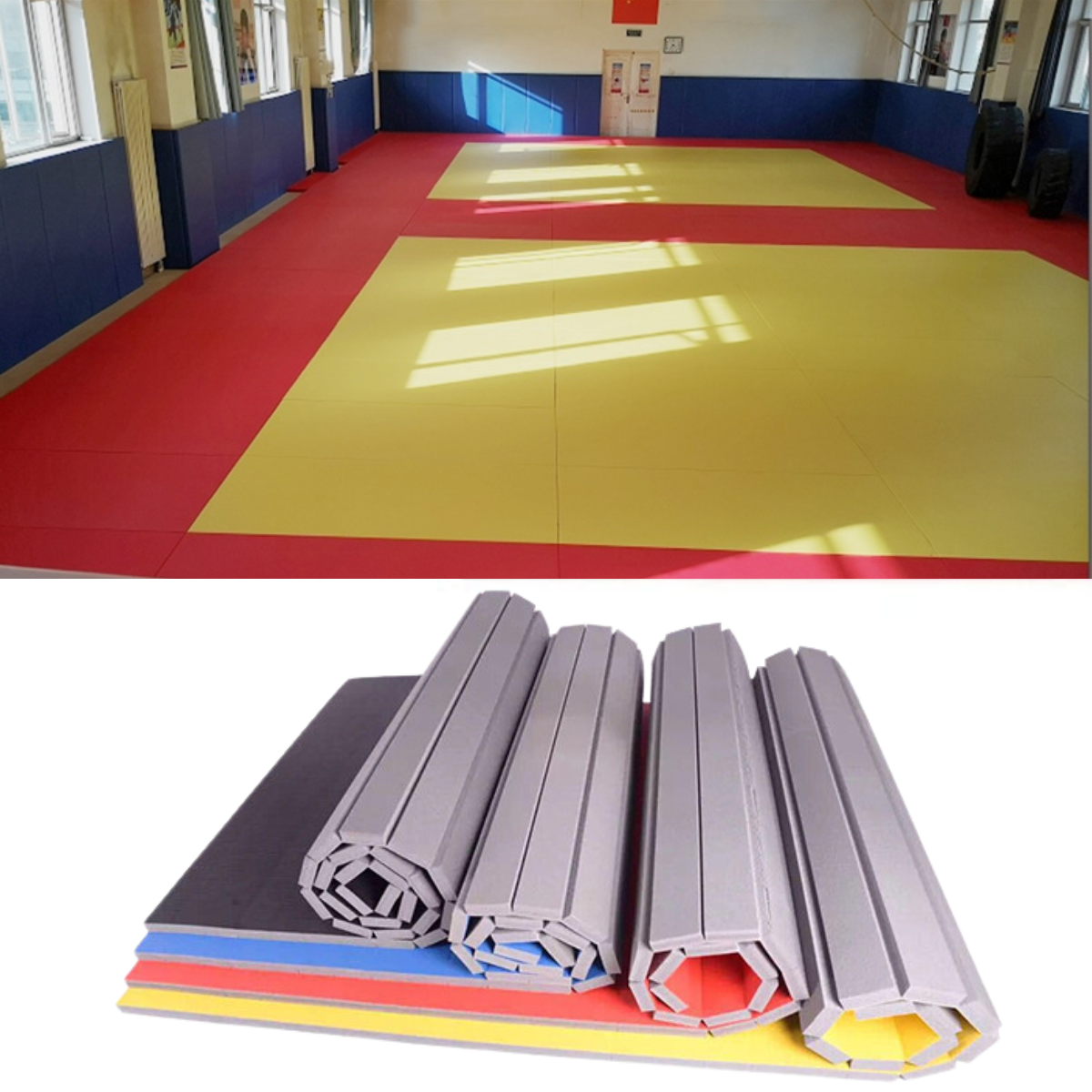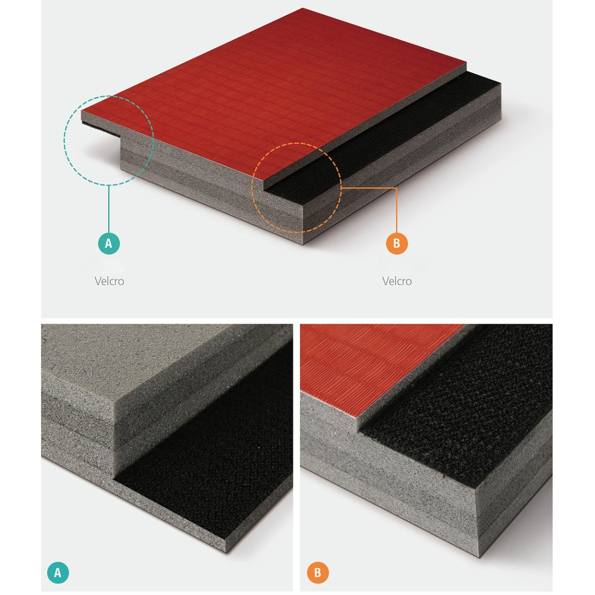 Tablado para judô e jiu jitsu com velcro de fácil instalação e armazenamento, fabricado em polietileno reticulado (XPE) de alta densidade para amortecimento, minimizando os impactos e as lesões, cobertura em PVC texturizado para garantir melhor aderência e resistência a ruptura e base com fundo antiderrapante. Fabricado em 4 rolos de 1,5x14m, 9 rolos de 1,5x8m, 1 rolos de 0,5x8m com 40mm de espessura, utilizando velcro para unir as placas e formar a área medindo 14x14m com 196m². Por ser fabricado em rolos, pode ser desmontado, transportado e montado em diferentes centros esportivos com facilidade.